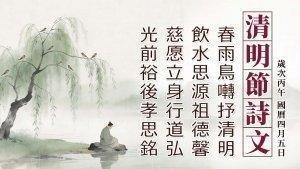 春雨鳥囀抒清明 飲水思源祖德馨 慈愿立身行道弘 光前裕後孝思銘